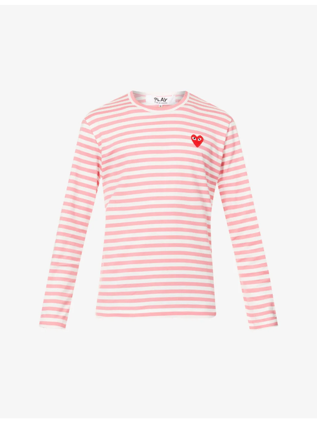 PRODUCT DETAILS - Comme des Garcons PLAY cotton-jersey top - 100% cotton - Pulls on - Crewneck, dropped shoulders, long sleeves, all-over striped pattern, signature patch at chest, regular fit - Hand wash - Made in Japan - Model is 6ft 2in/1.88m and wears a size medium - Lightweight, slight stretch Ref: R03717056
