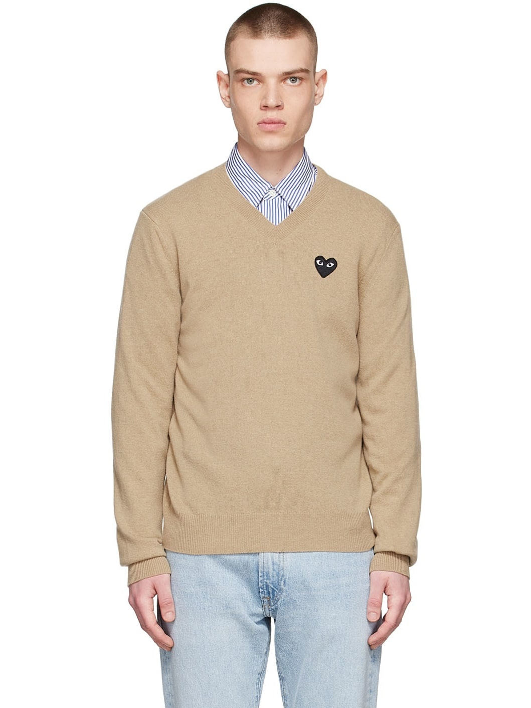 Knit wool sweater. · Embroidered logo patch at chest · Rib knit V-neck, cuffs, and hem Supplier color: Beige 100% wool.