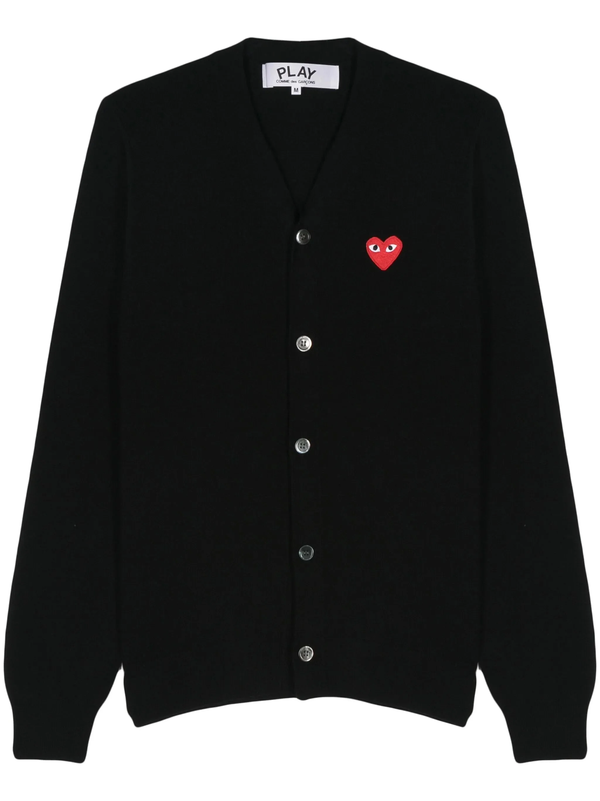 Unisex V-Neck Cardigan Red Heart in Black from Comme des Garcons Play Highlights - black - embroidered black heart - v-neck - front button closure - long sleeves - straight hem Made in Japan Designer ID: AX-N008-051 Colour ID: 1-Black Materials 100% Wool