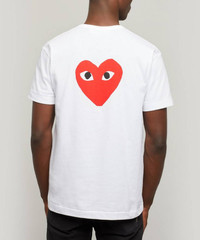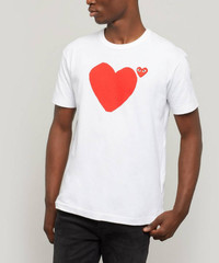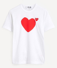 Editor's Notes Comme des Garçons PLAY presents this short sleeved t-shirt, featuring a reworking of the label’s instantly recognisable logo. The iconic heart logo is repeated on the front and back of this t-shirt from PLAY, in print and embroidery – wear it and become part of the Comme des Garçons community. Pair with rolled up jeans and white sneakers for a fresh look. Features Logo t-shirt Short sleeves Red heart logo to front and back Embroidered and printed motifs Round neck Relaxed fit SIZE & FIT Model is 186cm/6’1" and wears size L Composition & Care 100% Cotton Hand wash only