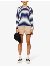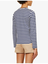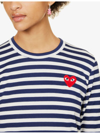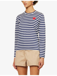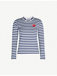 PRODUCT DETAILS - Comme des Garcons PLAY cotton-jersey T-shirt - 100% cotton - Slips on - Regular fit, round neck, ribbed trim at neck, long sleeves, brand applique at chest, all-over stripe pattern - Machine wash cold - Made in Japan - True to size - Size small: length 24in / 61cm - Model is 5ft 10in/1.78m and wears a size small - Lightweight, slight stretch Ref: 143-2000022-P1T009