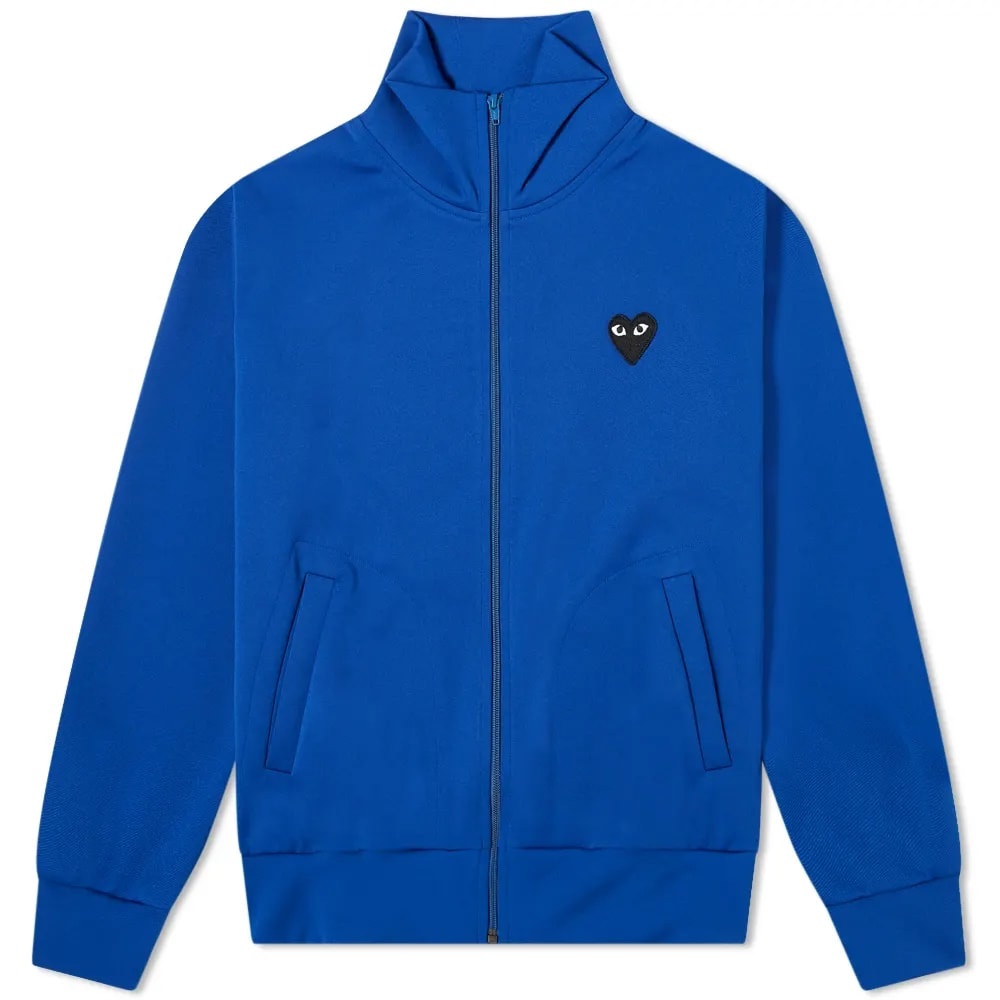In bright, electric blue, this Comme de Garçons PLAY track top combines retro athleisure with Japanese craftsmanship. It features the brand's iconic bug eyed heart front and back for a decorative finishing touch. - 100% Polyester - Stand Collar - Zip Closure - Appliqué Branding & Printed Branding - 2 Side Pockets - Ribbed Trims - Made in Japan