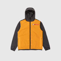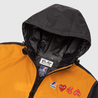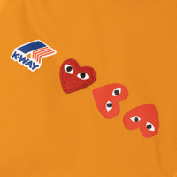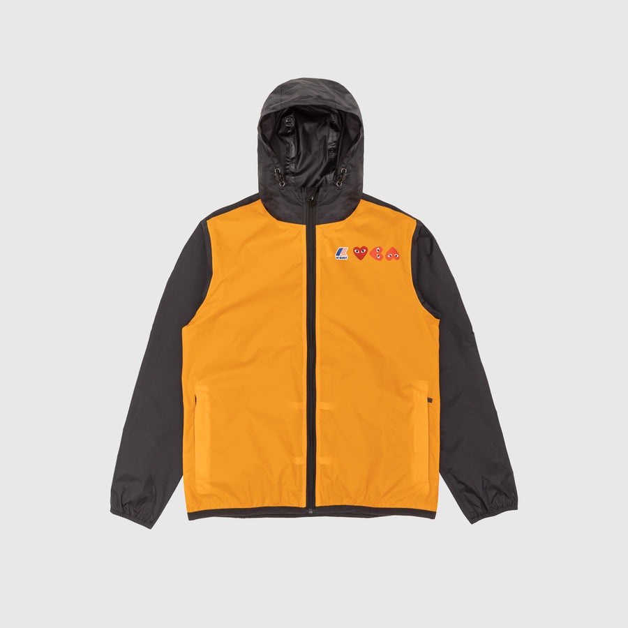 - AZ-J505-051-1 - Orange/Black - Comme des Garçons Play joins forces with K-Way, knownfor their development of the original wind & waterproof packable jacket, on a full zip weather-ready hoodie - 100% Nylon - Water-resistant Ripstop Nylon - Front zip closure - Pullover hood with adjustable drawcord - Two side welted pockets - Dual branding at chest - Elastic cuffs and hem - Adjustable drawcord at hem - Pac-a-way zipped pocket