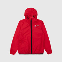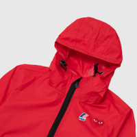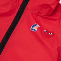 - AZ-J501-051-2 - Red - Comme des Garçons Play joins forces with K-Way, knownfor their development of the original wind & waterproof packable jacket, on a full zip weather-ready hoodie - 100% Polyamide - Ripstop weave providing water & wind repellant features - Classic hood with drawcord - Dual branding at chest - Zip closure - Two concealed hand pockets with zip closure - Heat-taped seams - Elasticated cuffs and hem