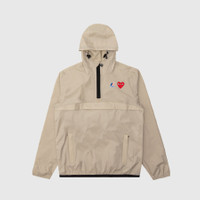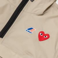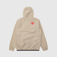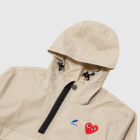 - AZ-J502-051-3 - Beige - Comme des Garçons Play joins forces with K-Way, knownfor their development of the original wind & waterproof packable jacket, on a half zip weather-ready hoodie - 100% Polyamide - Ripstop weave providing water & wind repellant features - Classic hood with drawcord - Dual branding at chest - Quarter zip closure - Concealed chest pocket with zip closure - Two concealed hand pockets with zip closure - Heat-taped seams - Elasticated cuffs and hem