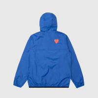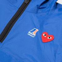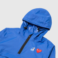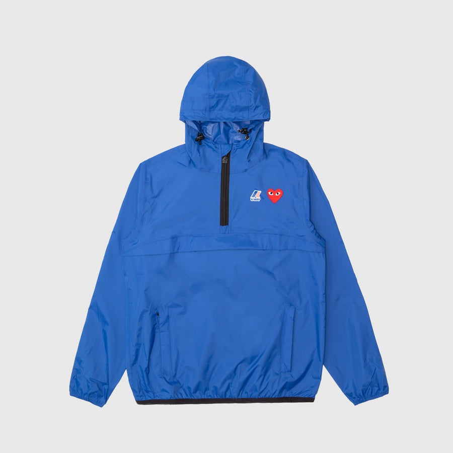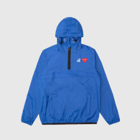 - AZ-J502-051-2 - Blue - Comme des Garçons Play joins forces with K-Way, knownfor their development of the original wind & waterproof packable jacket, on a half zip weather-ready hoodie - 100% Polyamide - Ripstop weave providing water & wind repellant features - Classic hood with drawcord - Dual branding at chest - Quarter zip closure - Concealed chest pocket with zip closure - Two concealed hand pockets with zip closure - Heat-taped seams - Elasticated cuffs and hem