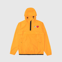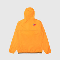 - AZ-J502-051-1 - Orange - Comme des Garçons Play joins forces with K-Way, knownfor their development of the original wind & waterproof packable jacket, on a half zip weather-ready hoodie - 100% Polyamide - Ripstop weave providing water & wind repellant features - Classic hood with drawcord - Dual branding at chest - Quarter zip closure - Concealed chest pocket with zip closure - Two concealed hand pockets with zip closure - Heat-taped seams - Elasticated cuffs and hem