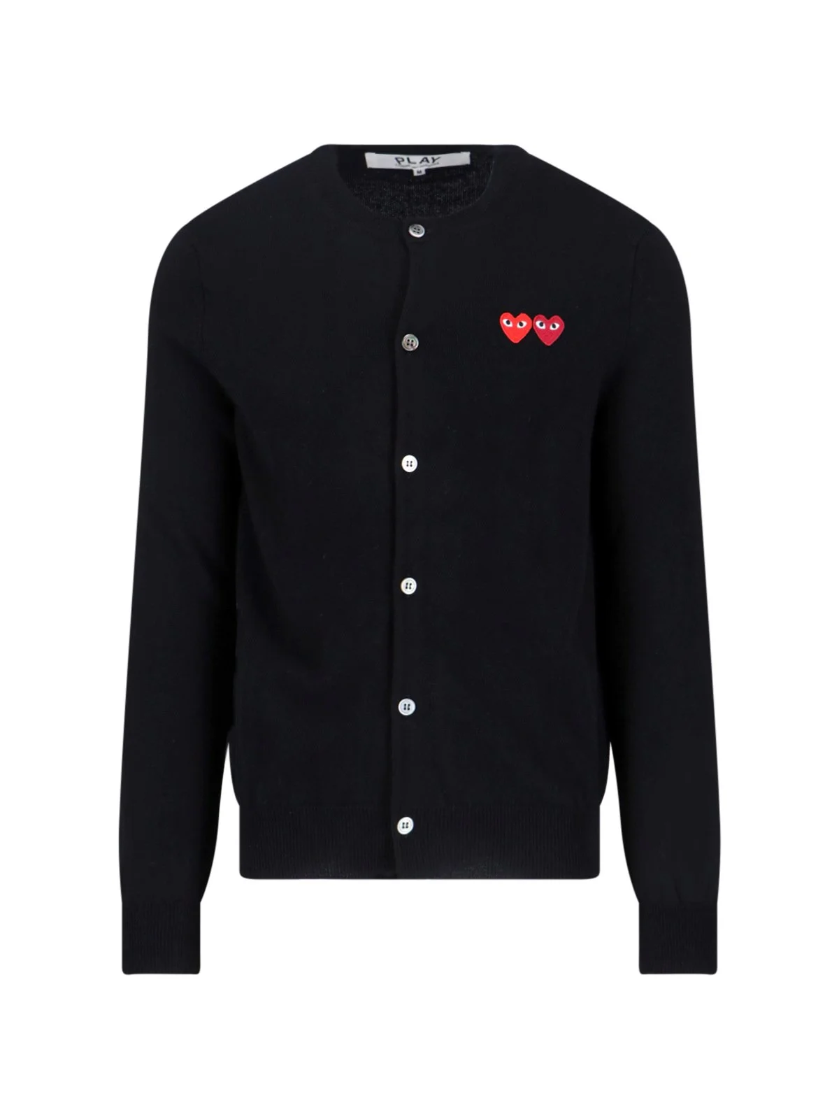 COMME DES GARCONS PLAY LOGO CARDIGAN IN BLACK WOOL WITH CREWNECK, BUTTON CLOSURE, EMBROIDERED DETAIL ON THE FRONT, RIBBED TRIM, AND STRAIGHT HEM. PRODUCT INFO PRODUCT CODE AX N057 0511 COMPOSITION: 100% WOOL SIZE AND FIT: REGULAR FIT MADE IN: JAPAN