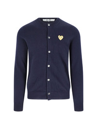 COMME DES GARCONS PLAY LOGO CARDIGAN IN NAVY BLUE WOOL WITH ROUND NECKLINE, BUTTON CLOSURE, CONTRASTING EMBROIDERED LOGO PATCH ON THE FRONT, RIBBED TRIM, AND STRAIGHT HEM. PRODUCT INFO PRODUCT CODE AX N049 0512 COMPOSITION: 100% WOOL SIZE AND FIT: REGULAR FIT MADE IN: JAPAN