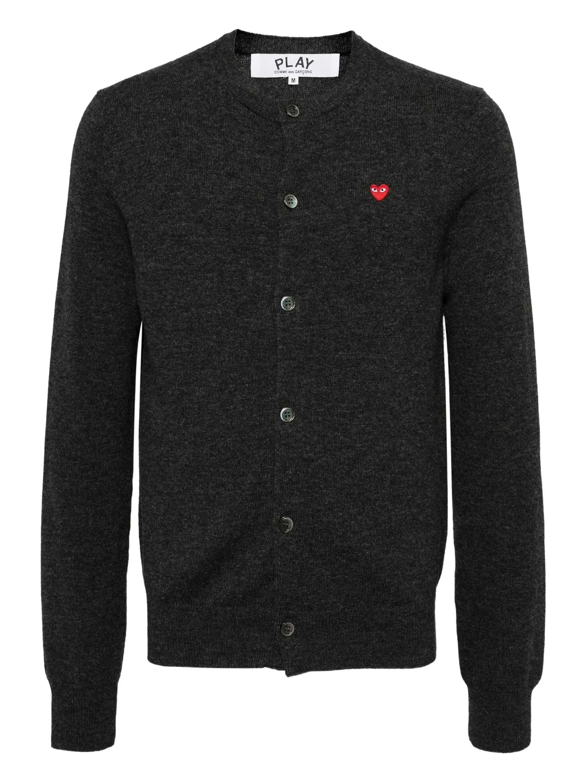 Unisex Cardigan Red Heart in Black from Comme des Garcons Play Highlights - black - round neck - front button closure - red embroidered heart logo on chest - long sleeves - straight hem Made in Japan Designer ID: AX-N079-051 Colour ID: 01 BLACK Materials 100% Wool DO NOT WASH. WARM IRON. DRYCLEAN ANY SOLVENT, SHORT CYCLE.