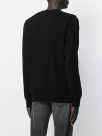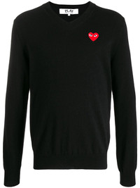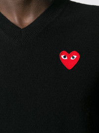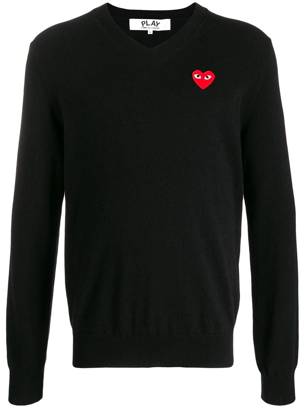 logo embroidered jumper Black wool logo embroidered jumper from Comme Des Garçons Play featuring a v-neck, long sleeves and an embroidered logo to the front. Imported Composition Wool 100% SIZE & FIT Model measurements Height 6 ft 1 in(1.86 m) Bust/Chest 35.82 in(91 cm) Hips 37 in(94 cm) Waist 28.74 in(73 cm) FittingInformation Designed for a relaxed fit, this piece allows for comfort and movement when worn Made from a midweight non-stretch fabric, this piece offers minimal elasticity when worn This piece fits small – take one size up