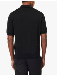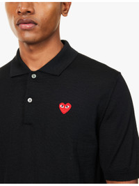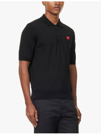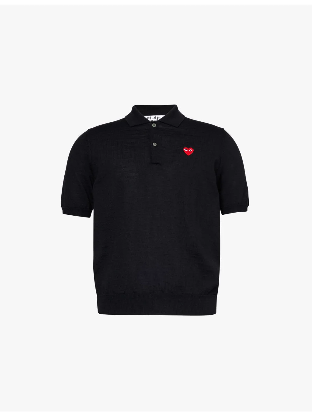 PRODUCT DETAILS - Comme des Garcons PLAY wool polo shirt - 100% wool - Exposed button fastening at front - Polo collar - Elasticated cuffs - Regular fit, collar, short sleeves, heart patch at front, all over fine-knit pattern, ribbed trims - Dry clean - Made in Japan - Model is 6ft 2in/1.88m and wears a size medium - Lightweight, stretchy Ref: R04351661