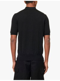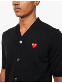 PRODUCT DETAILS - Comme des Garcons PLAY wool cardigan - 100% wool - Exposed button fastening at front - Regular fit, V neck, short sleeves, heart patch at front, all over fine-knit pattern, ribbed trims - Dry clean - Made in Japan - Size medium: length 26in / 66cm - Model is 6ft 2in/1.88m and wears a size medium - Lightweight, stretchy Ref: R04351660