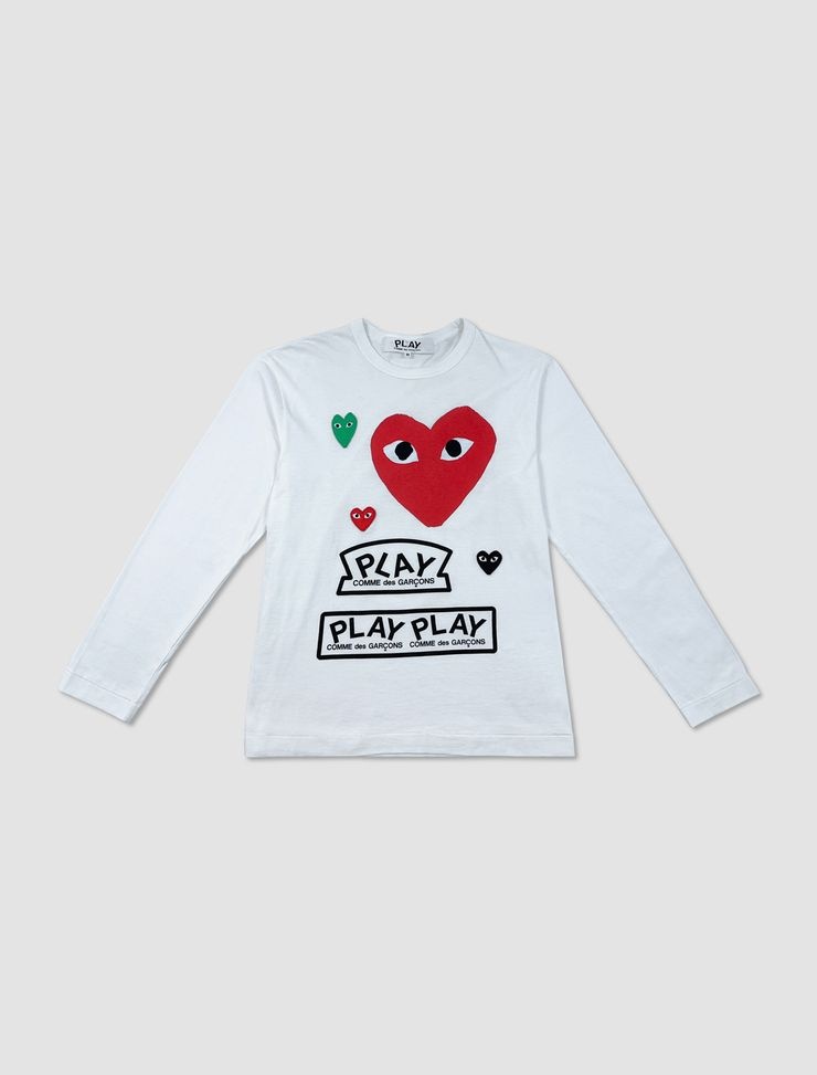 Long-sleeved white t-shirt by Comme des Garcons Play with the signature red heart logo with bug eyes. This round-necked T-shirt has its brand name printed on the front. Product Reference Code: P1T284 1