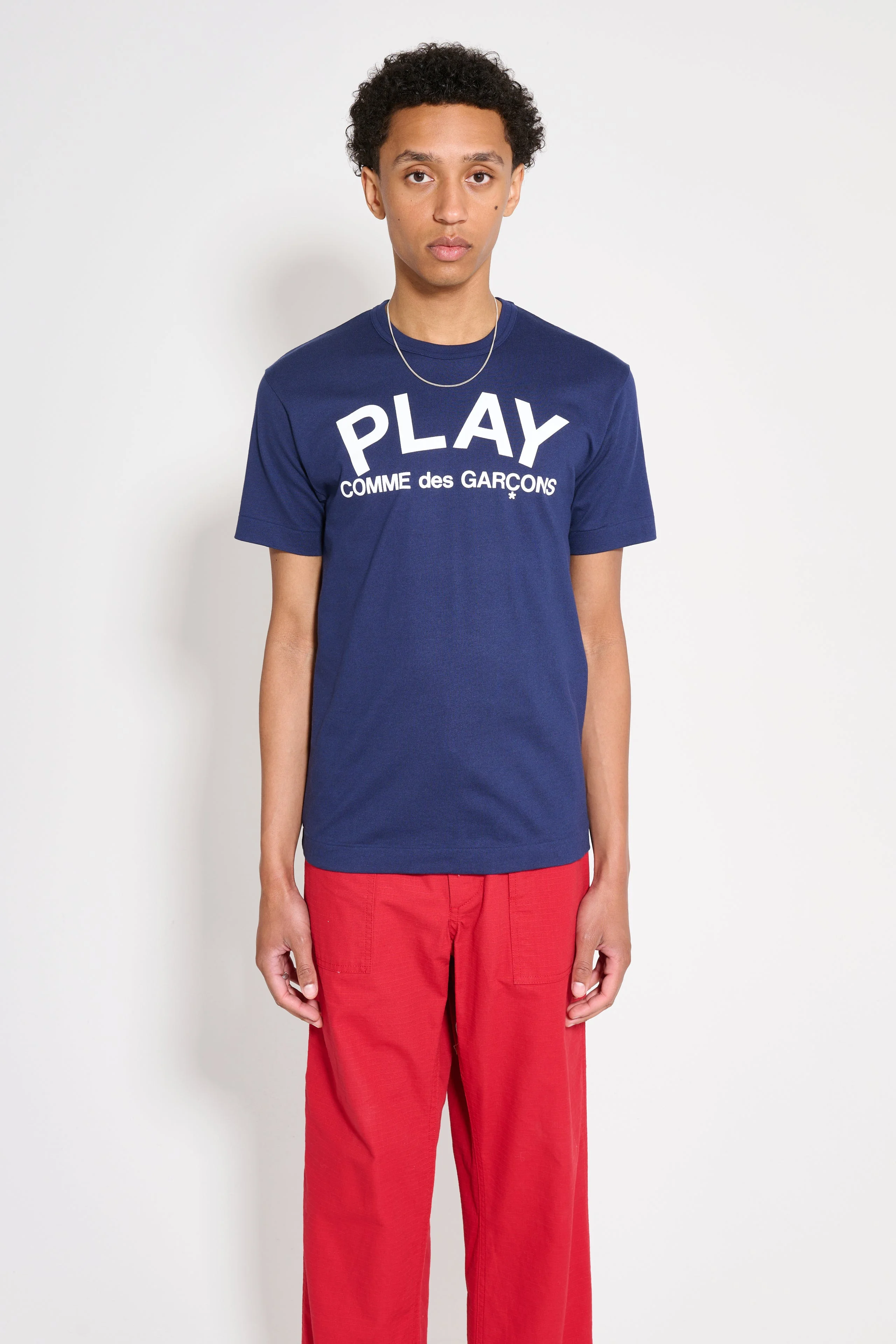 T-shirt from Comme des Garçons Play. Ribbed round-neck. Large contrasting logo print on the front. Short sleeves and a straight hem. Details Dark navy t-shirt. Made in Japan from 100% cotton. Art. No: P1T176 ART. NO: P1T176 Size & fit Straight fit. Model wears a size Large and measures 188 cm with a 93 cm chest.