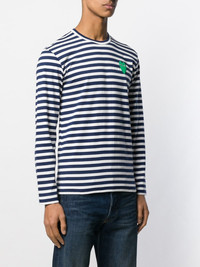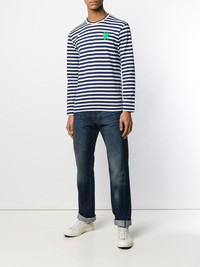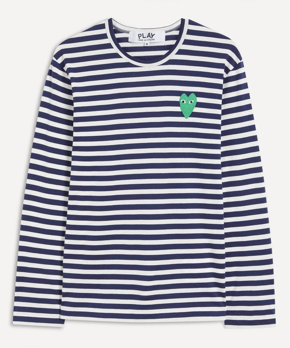 Editor's Notes A reflection of the brand’s sophisticated craftmanship, this striped long sleeve t-shirt from Comme des Garçons PLAY will lend a premium touch to your everyday edit. Adorned in an all-over stripe, this piece is characterised by a long sleeve silhouette with classic crew-neckline. The contrasting, blue and white horizontal stripe makes for a striking garment, meanwhile the aqua-toned embroidered logo patch to the chest proudly punctuates the fashion house’s signature emblem. Pair with wide leg jeans and sneakers to complete the look. Features Men’s striped t-shirt Long sleeve silhouette Crew-neckline All over blue and white horizontal stripe Comme des Garçons logo patch to chest Pure cotton composition SIZE & FIT Model is 188cm/6'2"; Chest: 90cm, Waist: 74cm and wears size M Composition & Care 100% Cotton Gentle machine wash at maximum 30°C About Comme des Garçons Play Instantly recognisable the world over, Comme des Garçons PLAY’s red heart-with-eyes logo was created by Polish artist Filip Pagowski. PLAY launched in 2002 and is designed by Comme des Garçons founder Rei Kawakubo. Snubbing traditional fashion seasons, the label produces playful, often logo-adorned ready-to-wear, alongside sought-after collaborations with other artists and creatives.