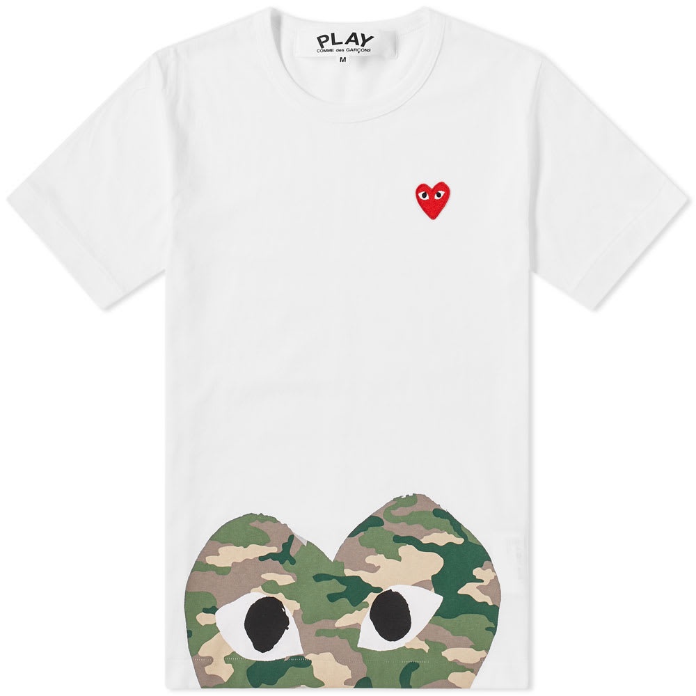 A camouflaged style that is meant to be seen, this cotton tee fromComme des Garçons PLAY will fall seamlessly into your everyday tee rotation. Peeping out from the hemline, the short-sleeved style is branded with a signature heart-and-eyes graphic, while the iconic red heart is worn proudly to the chest. - 100% Cotton - Ribbed Crewneck - Heart Appliqué - Heart Print - Made in Japan