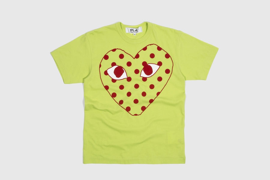 - AZ-T276-051GRN - Pastelle Green/Red - 100% Cotton - Ribbed crewneck collar - Center screen-printed Polka dot 'Big Heart' - Made in Japan