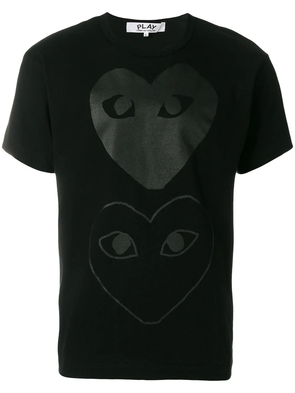 printed T-shirt Black cotton printed T-shirt from Comme Des Garcons Play. Imported Composition Cotton 100% SIZE & FIT Model measurements Height 6 ft 2 in(1.87 m) Bust/Chest 37.79 in(96 cm) Hips 37.79 in(96 cm) Waist 30.31 in(77 cm) FittingInformation Designed for a relaxed fit, this piece allows for comfort and movement when worn Made from a midweight non-stretch fabric, this piece offers minimal elasticity when worn This piece fits small – take one size up