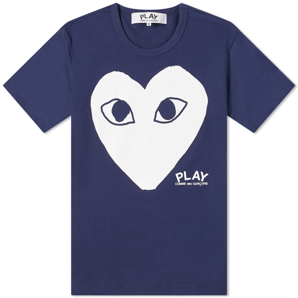 Show off your big-hearted side with this navy Comme des Garçons PLAY tee. It’s made in Japan from pure cotton (and love) and finished with a large white heart, complete with signature bug eyes, across the chest. This product is cut from a raw Japanese cotton, as a result shrinkage may occur upon washing. We advise closely following the care instructions provided. - 100% Cotton - Ribbed Crewneck - Printed Branding - Made in Japan