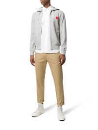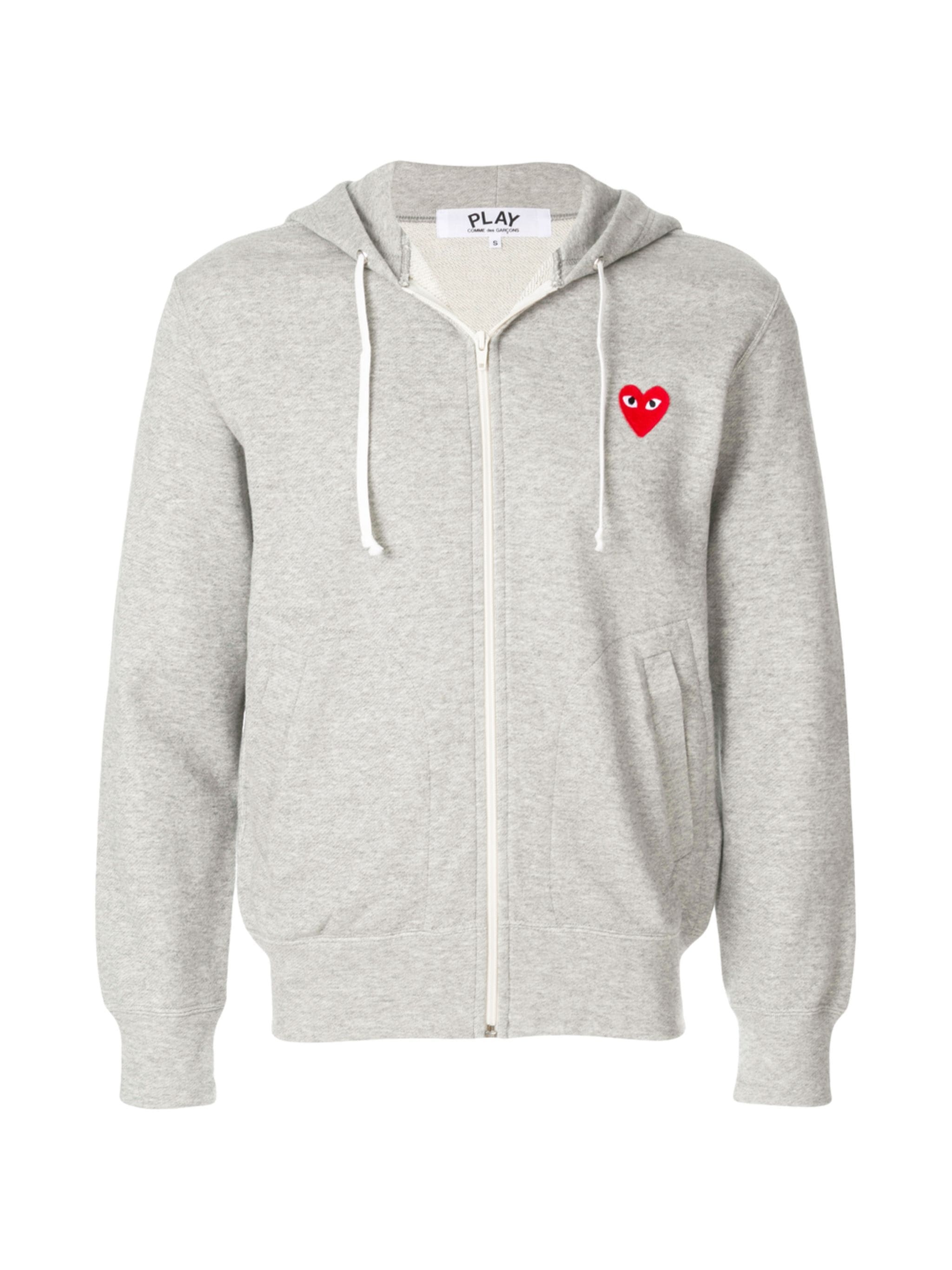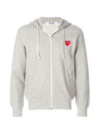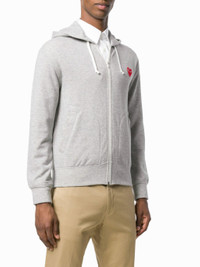 Grey cotton heart patch hoodie from Comme Des Garcons Play featuring a front zip fastening, long sleeves, kangaroo pockets and a ribbed hem and cuffs. Size & Fit Model Measurements: Height: 1.81 m Bust/Chest: 80.0 cm Hips: 91.0 cm Waist: 61.0 cm Model wears size S Fabric and Care Designer Style ID: AXT168051 Designer Colour: 1 - GRAY Composition: Cotton 100% Washing instructions: Machine Wash Made in Japan