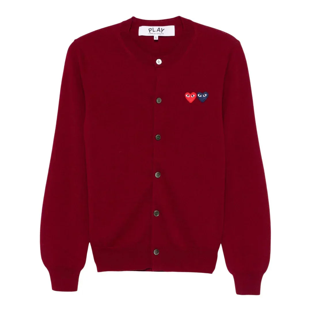 COMME des GARCONS PLAY Round-Neck Double Emblem Cardigan delivers minimalist Japanese luxury with playful signature detailing. Crafted from premium wool knit in rich burgundy, featuring the iconic red and blue heart emblems on the chest. The classic button-front construction and relaxed fit create a versatile wardrobe essential with distinctive PLAY character.