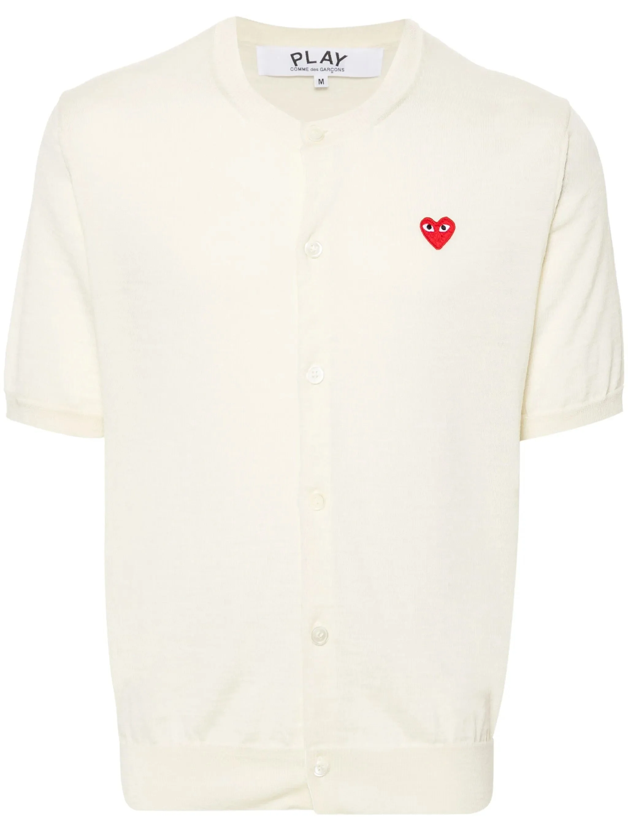 Unisex Round-Neck Cardigan Short-Sleeve in Off White from Comme des Garcons Play Highlights - off white - red embroidered heart - round neck - front button closure - short sleeves - straight hem - unisex Made in Japan Designer ID: AX-N095-051 Colour ID: Off White Materials 100% Wool