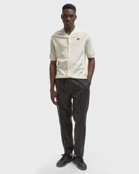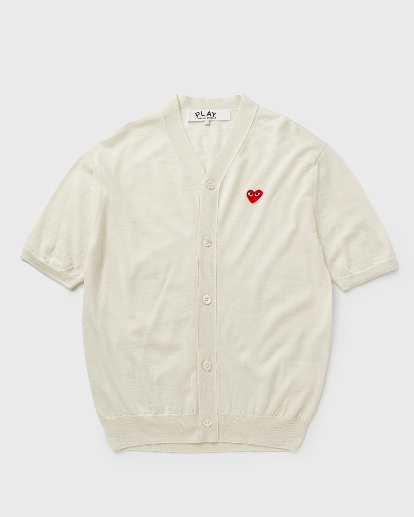 The lightweight Comme des Garcons Play cardigan is made from 100% wool and features a V-neck and short sleeves. An iconic red heart patch on the chest completes the design. - Button placket - Short sleeves - Heart patch - Made in Japan Article number: AX-N096-051-6 Gender: men Color: OFF WHITE Material: 100% Wool