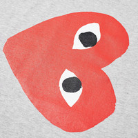 This grey tee puts a literal twist on Comme des Garçons PLAY’s beloved heart print. The red mascot boldly features at the chest of the soft grey cotton, peeping out as usual, but positioned on its side this time, adding a new dimension to the signature logo. - 100% Cotton - Ribbed Crewneck - Printed Branding - Made in Japan