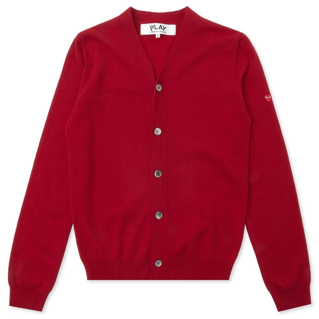 The concept of the Comme des Garcons PLAY line is design by not designing. Characterized by the iconic red heart logo designed by artist Filip Pagowski, the line is a collection of unisex basics, fragrances, and footwear for those who enjoy simplicity. Pictured is the Comme des Garcons PLAY Small Heart Cardigan in Red. COMME DES GARCONS PLAY APPAREL HAS A SMALLER FIT, WE RECOMMEND SIZING UP. THIS ITEM IS NOT ELIGIBLE FOR DISCOUNTS OR SPECIAL PROMOTIONS - 100% Wool - Ribbed edges - Made in Japan - Style no: AZ-N042-051-4