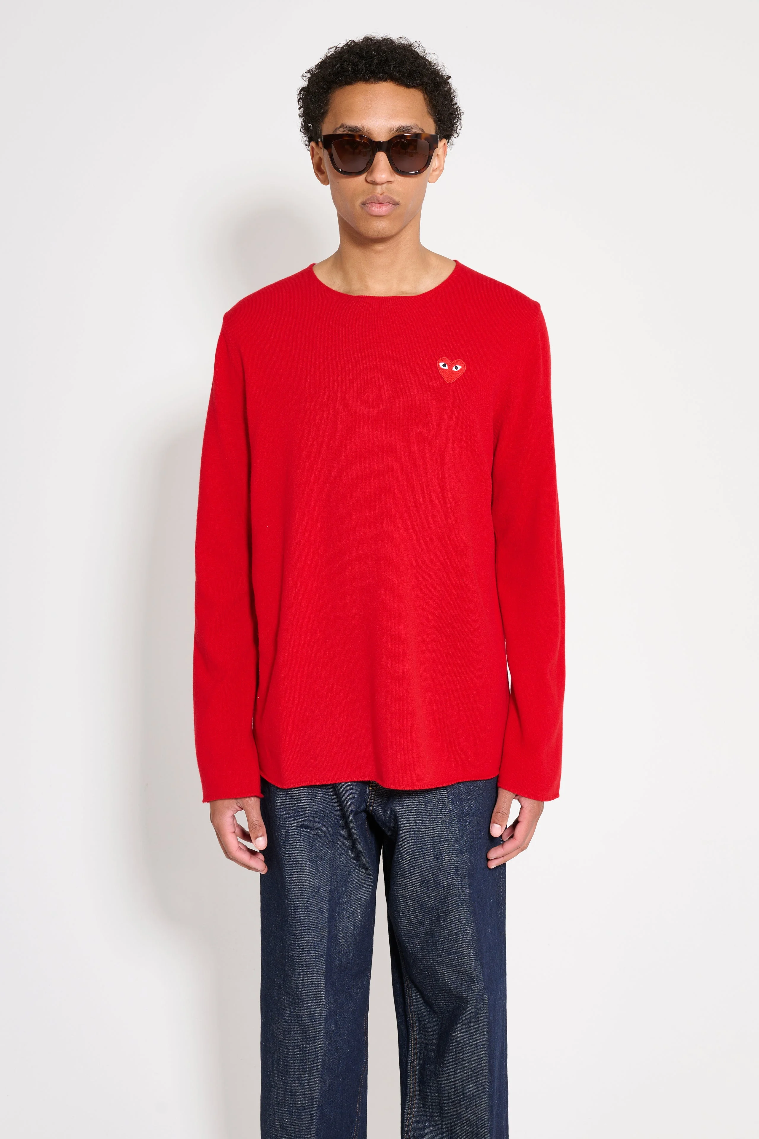 Sweater from Comme des Garçons Play. Round-neck with rolled edge, tonal sewn-on logo patch on the chest. Ribbed cuffs and hem. Details Red sweater. Made in Japan from 100% wool. Art. No: p1n068 ART. NO: p1n068 Size & fit Regular fit. True to size. Model wears a size Large and measures 188 cm with a 93 cm chest.