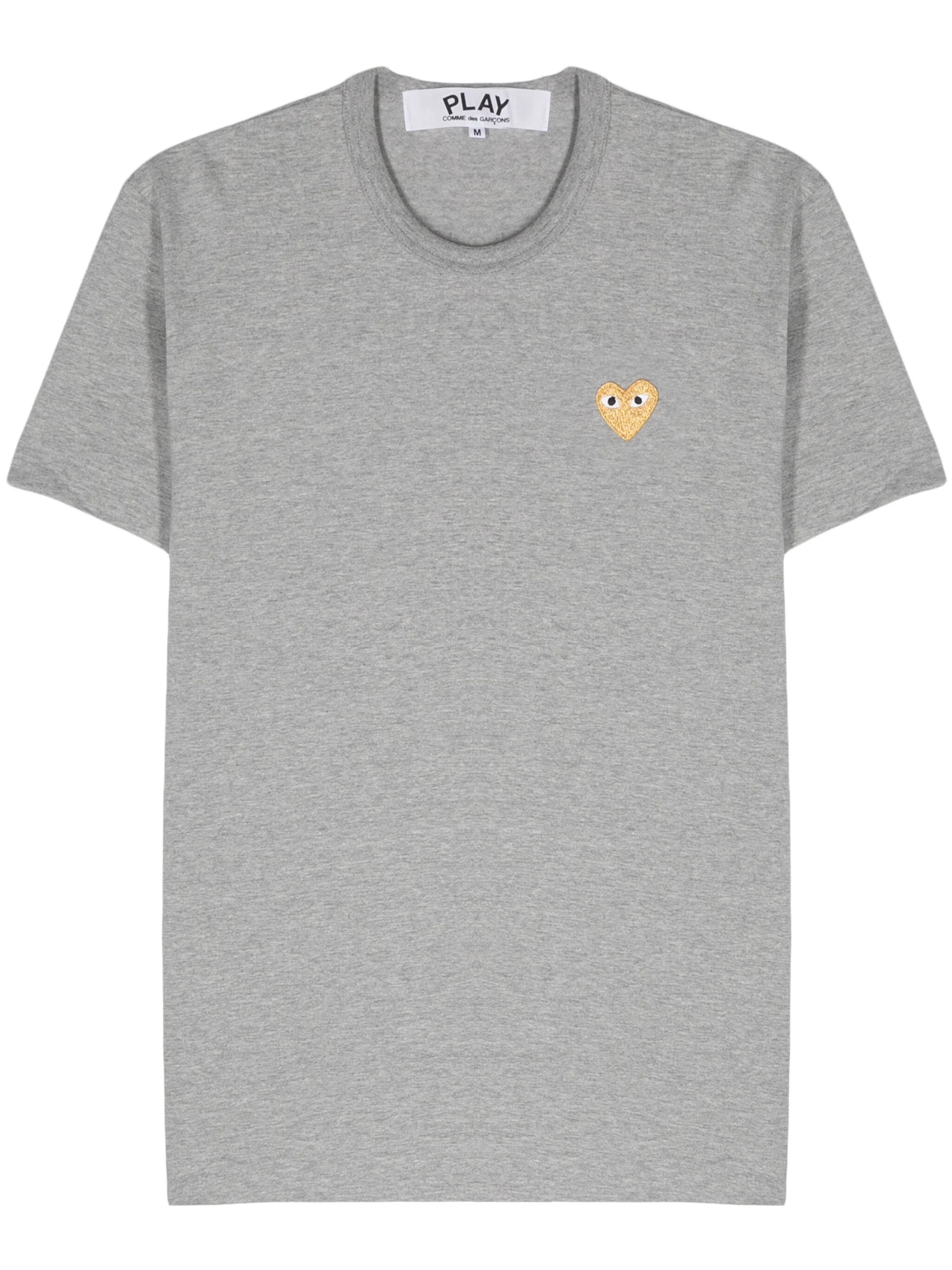 Unisex Short Sleeve Gold Heart in Grey from Comme des Garcons Play Highlights - grey - round neck - gold embroidered heart logo - short sleeves - straight hem Made in Japan Designer ID: AX-T216-051 Colour ID: 03 GREY Materials 100% Cotton Delicate Machine Wash