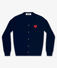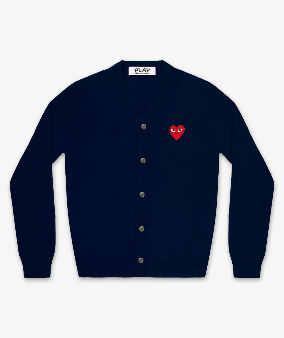 A classic V-neck cardigan featuring the iconic embroidered heart logo on the chest. Crafted from 100% wool for a refined and comfortable fit. DETAILS & FEATURES — Material: 100% wool — Features: V-neck design, embroidered heart logo — Style-No.: AX-N008-051 ABOUT THE BRAND Launched in 2012 as a branch of Comme des Garcons, CDG Play is distinguished by its iconic heart-shaped logo and has since developed a devoted following.