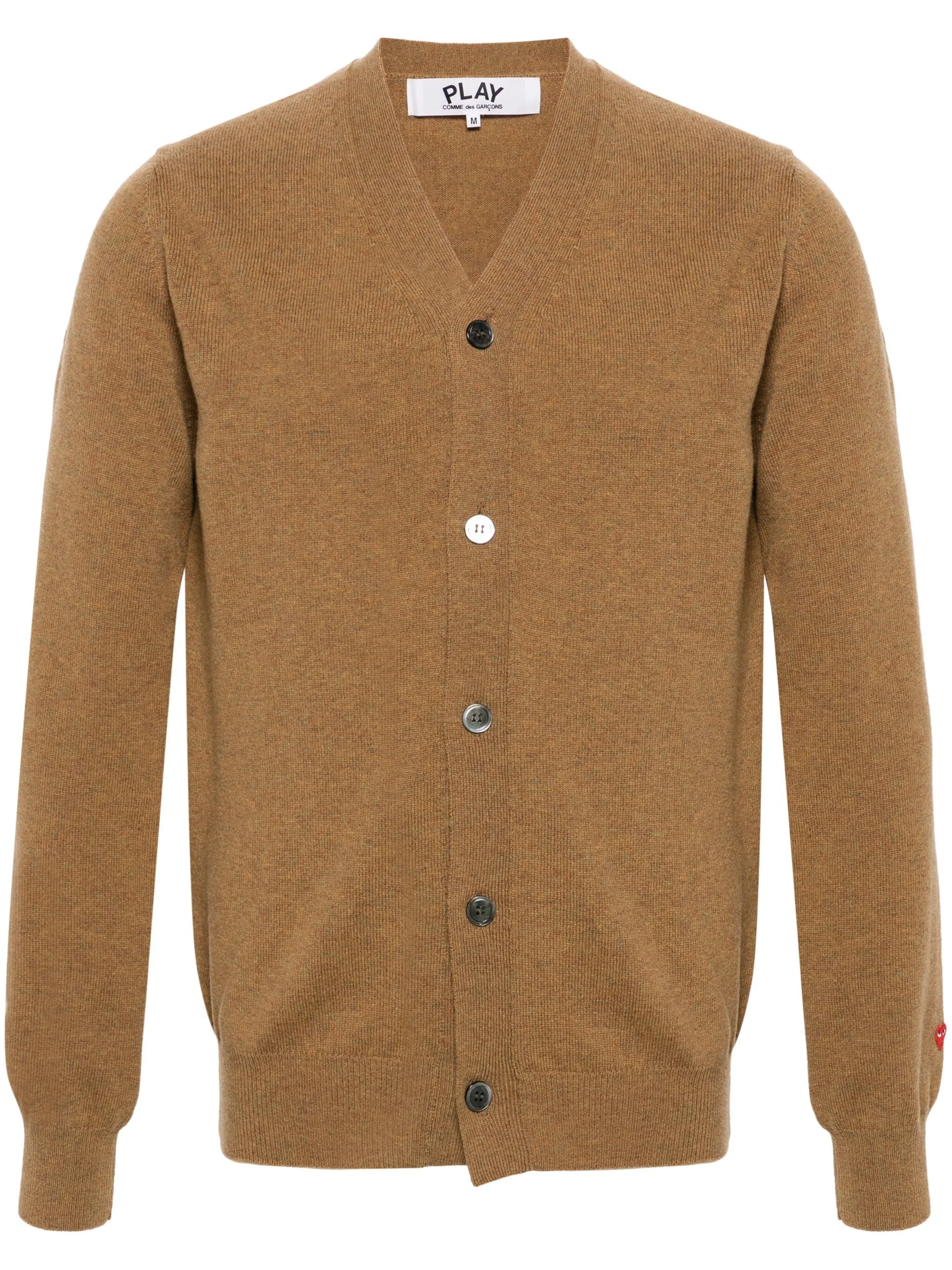 Unisex Knit Cardigan in Camel from Comme des Garcons Play Highlights - brown - v-neck - front button closure - red embroidered heart logo on sleeve - long sleeves - straight hem Made in Japan Designer ID: AX-N092-051 Colour ID: 03 Camel Materials 100% Wool DO NOT WASH. WARM IRON. DRYCLEAN ANY SOLVENT, SHORT CYCLE.