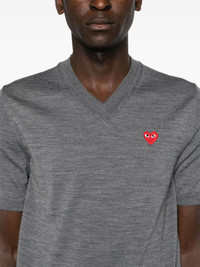 heart-patch wool jumper Highlights - Gunmetal grey - Wool - Fine knit - Melange effect - Signature heart patch - Ribbed v-neck - Short sleeves - Ribbed cuffs and hem - Straight hem - When buying this unisex item, keep in mind that it is graded in standard men's sizing. Imported Composition Wool 100% SIZE & FIT Model measurements Height 5 ft 10 in(1.77 m) Bust/Chest 33.07 in(84 cm) Hips 37 in(94 cm) Waist 24.8 in(63 cm) FittingInformation This unisex piece is designed for a relaxed fit whether you usually select women's or men's sizes Made with a midweight knit, this piece offers some stretch