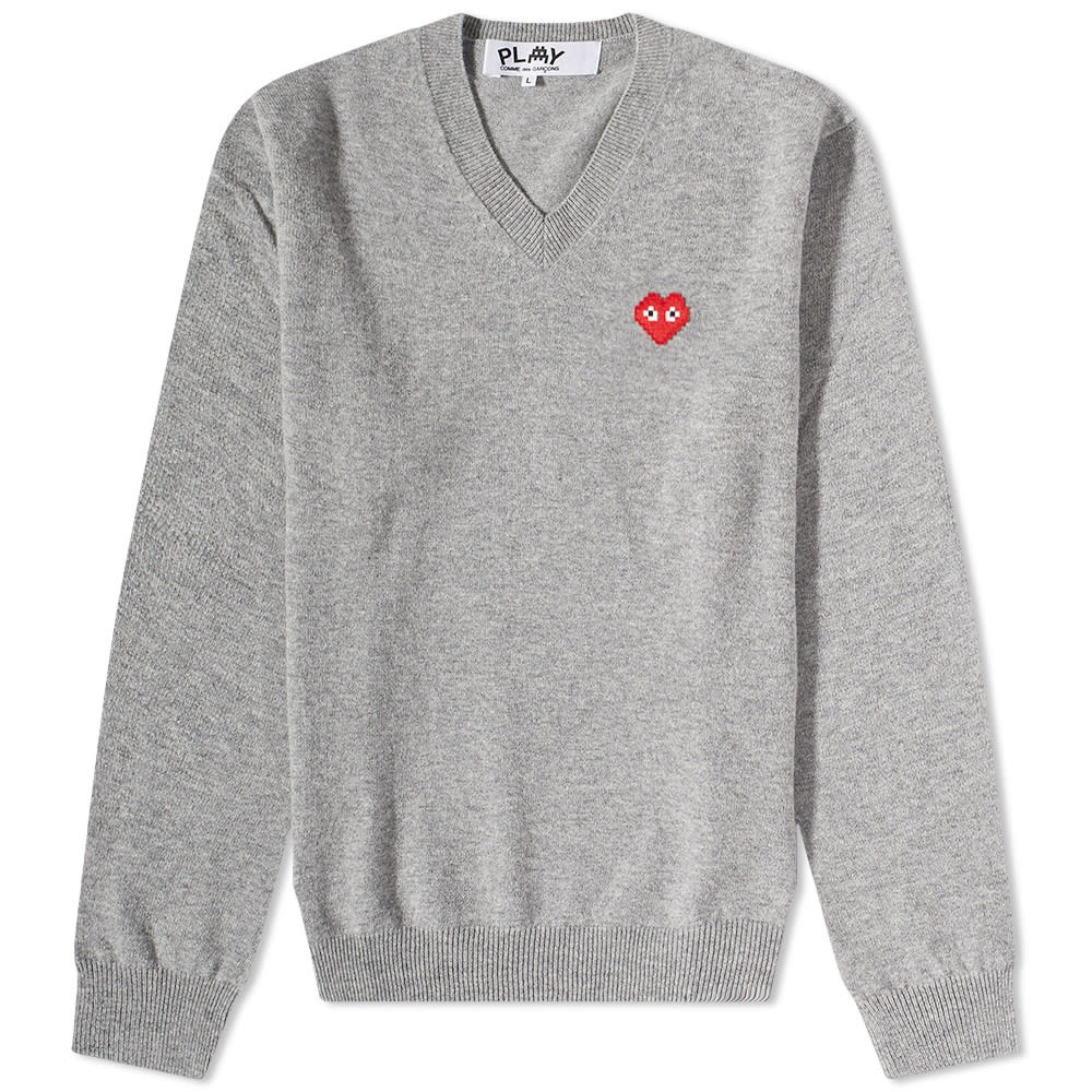 Become part of Rei Kawakubo's cult following in this grey v neck jumper from Comme des Garçons PLAY. A classic layering piece in any wardrobe, its instantly recognisable for its bug eyed heart, but this season the Filip Pagowski designed logo is given a pixelated makeover, teaming up with French street artist Invader. - 100% Wool - V Neck - Embroidered Branding - Ribbed Trims - Made in Japan
