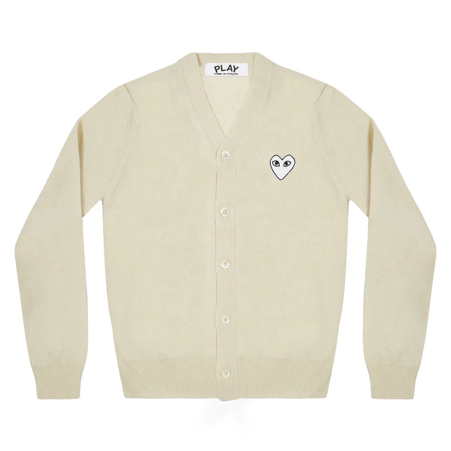 COMME des GARCONS PLAY White Emblem Cardigan Men Up your knitwear game with the help of this simple - but luxurious - COMME des GARCONS PLAY cardigan. Staying true to the label's minimalist aesthetic, it features the brand's iconic heart logo in white and is crafted from super-soft wool for easy, comfy wear. - 100% Wool - Natural - Relaxed fit - V neck - Long sleeve - Button-up placket - Signature embroidered logo on the chest