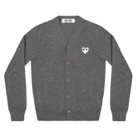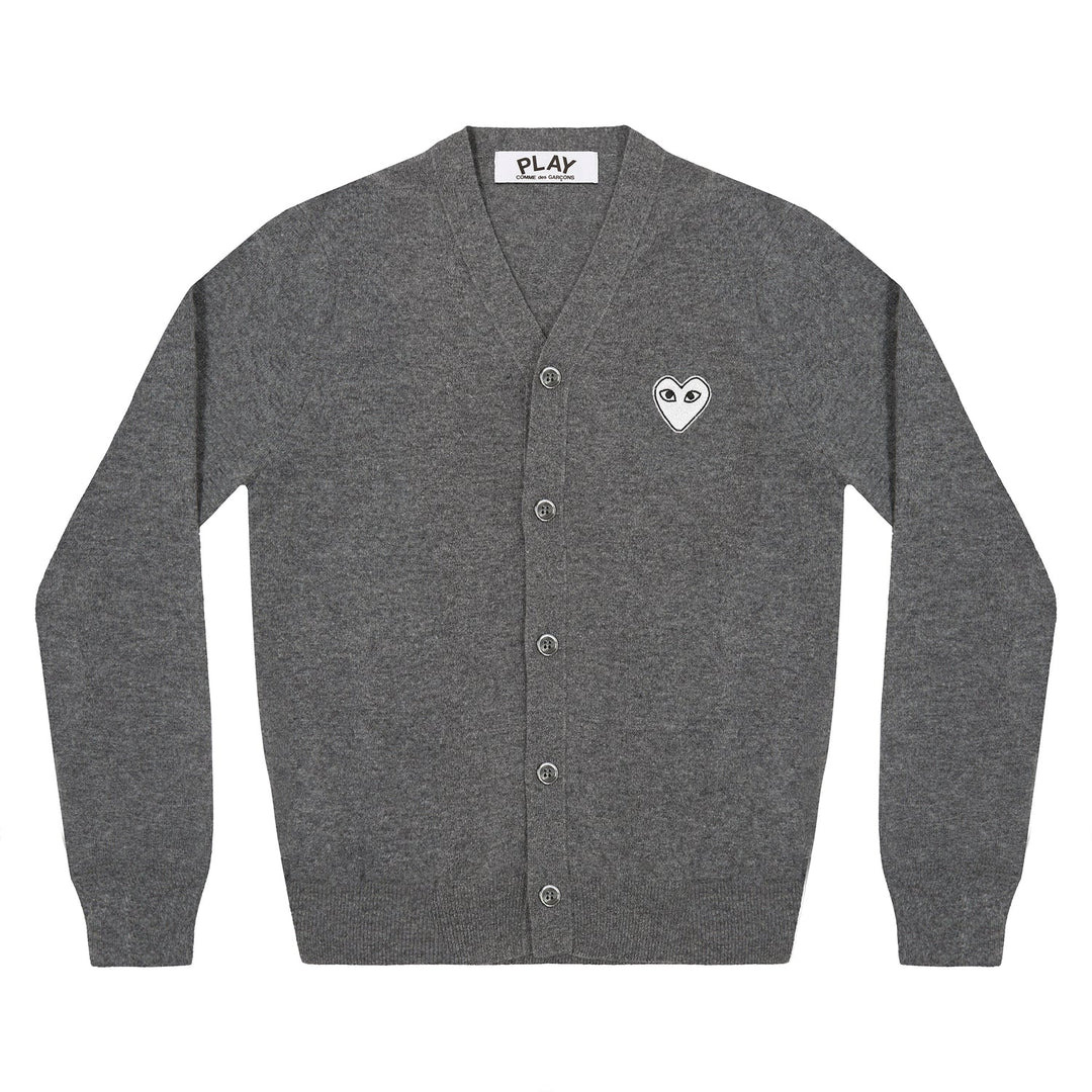 COMME des GARCONS PLAY White Emblem Cardigan Men Up your knitwear game with the help of this simple - but luxurious - COMME des GARCONS PLAY cardigan. Staying true to the label's minimalist aesthetic, it features the brand's iconic heart logo in white and is crafted from super-soft wool for easy, comfy wear. - 100% Wool - Grey - Relaxed fit - V neck - Long sleeve - Button-up placket - Signature embroidered logo on the chest