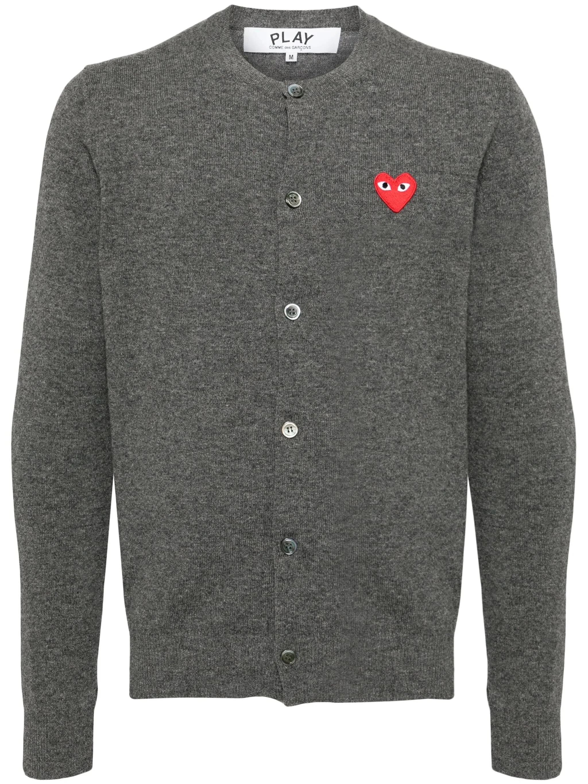 Unisex Round-Neck Cardigan Red Heart in Grey from Comme des Garcons Play Highlights - grey - embroidered black heart - round neck - front button closure - long sleeves - straight hem Made in Japan Designer ID: AX-N007-051 Colour ID: 3-Grey Materials 100% Wool