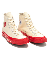Collaborative sneaker by COMME des GARÇONS PLAY and Converse. Vintage 1970's Chuck Taylor silhouette with CDG PLAY Heart and All-Star printed graphics. Durable cotton canvas upper. Contrasting vertical heel stripe with a contrasting colour toe cap and sole. Glossy aluminum eyelets. Woven cotton laces. DETAILS - In collaboration with Converse First String - Canvas upper - Contrast rubber toe cap and sole - Contrast heel stripe - Gloss aluminium eyelets - Woven cotton laces - PLAY heart logo print - Embroidered Converse logo - Vintage Converse heel plate - Rubber sole