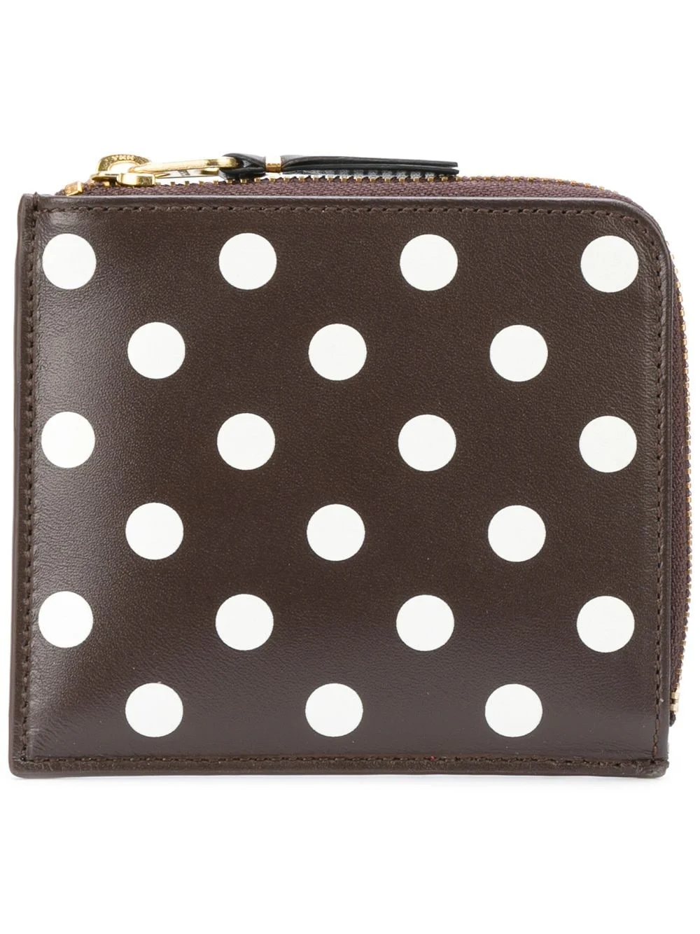 polka dot zipped wallet Dark brown calf leather polka dot zipped wallet from Comme Des Garcons Wallet featuring a side zip closure, an internal slip pocket and a polka dot print. This item is unisex. Imported Composition Calf Leather 100% SIZE & FIT Measurement WIDTH 3.93 in(10 cm) LENGTH 4.33 in(11 cm) DEPTH 0.59 in(1.5 cm)