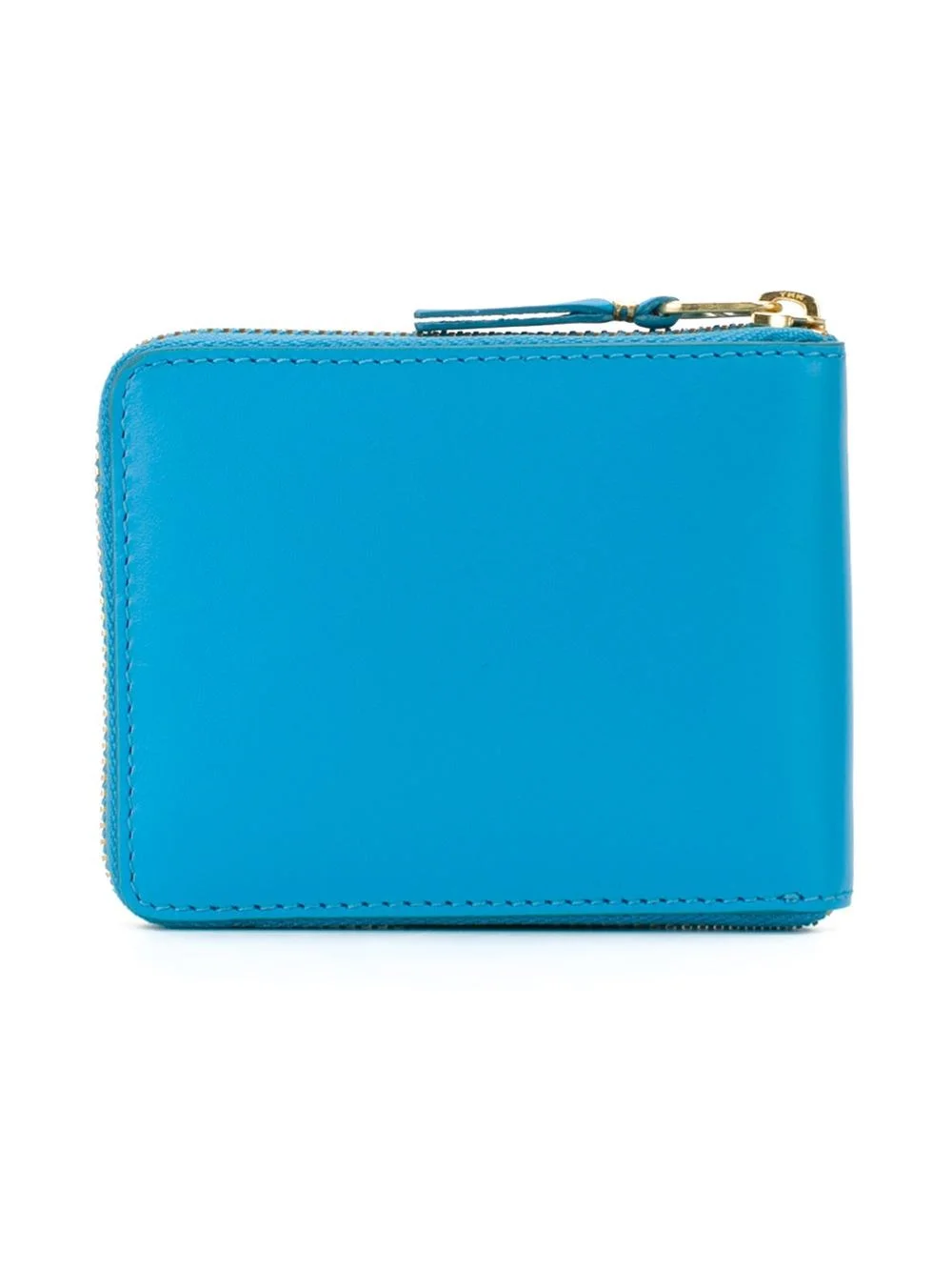 SA7100 Wallet in Blue from Comme des Garcons Wallet Highlights - blue - embossed logo stamp in the front - cold-tone top zip closure - clutch/wallet - one big compartment Measurements Length: 8,5 cm Width: 11 cm Made in Spain Designer ID: SA5100 Materials 100% Cowhide For surface stains, we recommend wiping with a damp cloth.