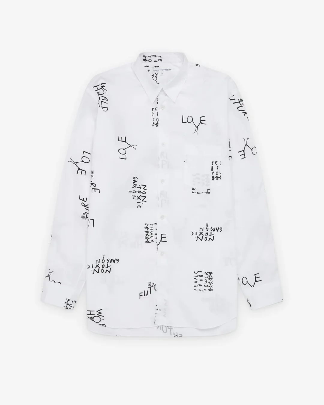 300051974WHT-LL / S6FQ-B039/051/2 - All-over text and graphic print - Classic shirt collar - Button-down front closure - Long sleeves with button cuffs - Premium cotton poplin construction - Regular fit - Straight hem The COMME des GARCONS SHIRT World Hope Shirt delivers avant-garde design with meaningful artistic expression and contemporary streetwear appeal. Crafted from premium cotton poplin in crisp white, featuring scattered text graphics and typography elements throughout the garment. The conceptual design language and signature CDG SHIRT aesthetic create a statement piece that merges fashion with social commentary.