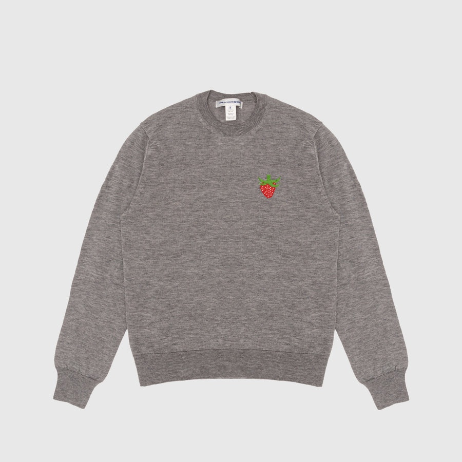 - FK-N016-S23-1 - Medium Grey - 70% Acrylic,30% Wool - Ribbed crewneck, cuffs, and hem - Knitted strawberry graphic at chest - Regular fit - Made in Japan