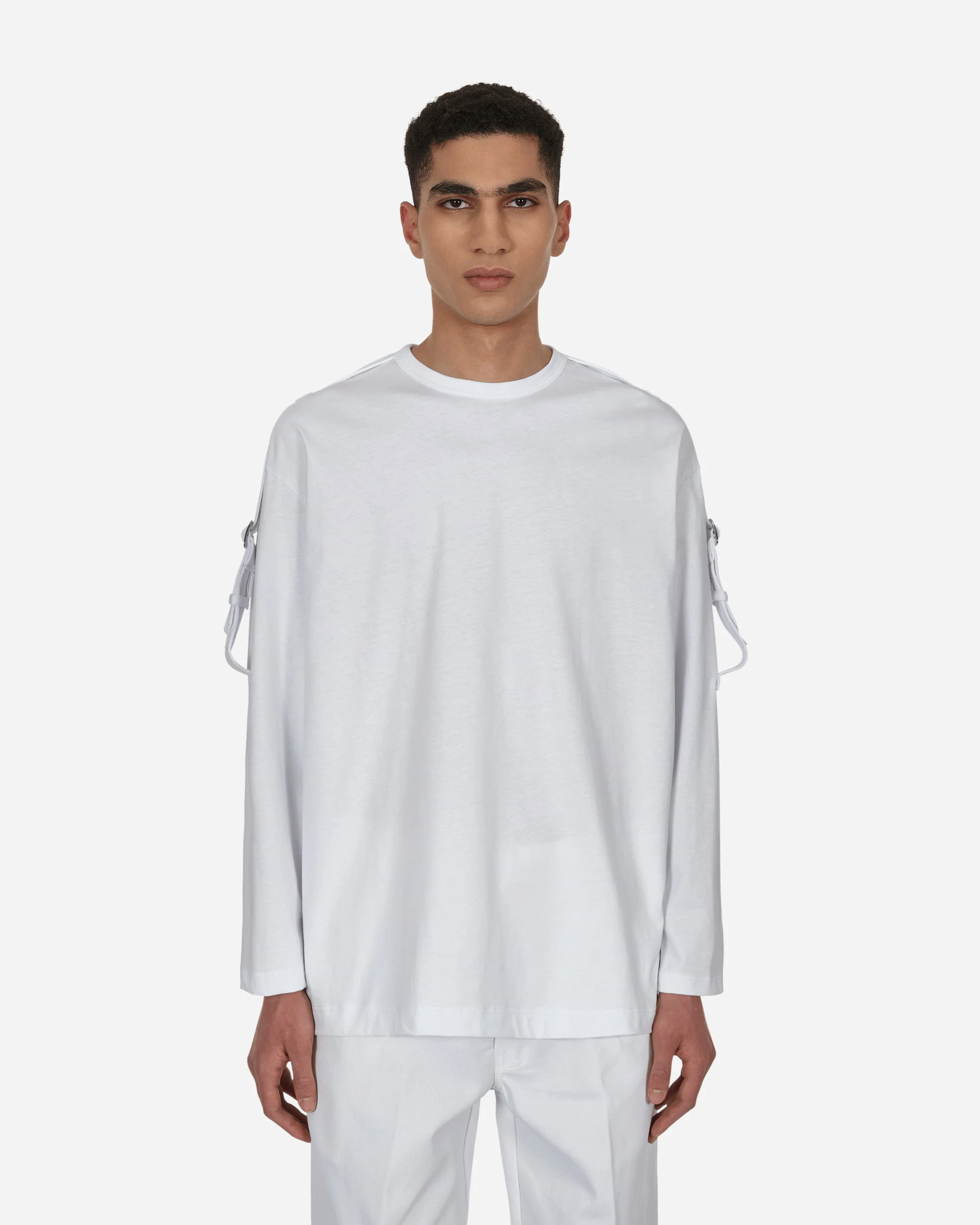 Comme Des Garçons Shirt Buckle Longsleeve T-Shirt White - 100% Cotton - Lightweight Cotton Fabric - Ribbed Crewneck - Buckle Detail at Shoulders - Style Code: FI-T012 2 SIZE & FIT Model is 6ft 1in/1.86m with 35"/90cm chest and wears size L. Measures (Size L): 55cm Shoulders, 65cm Chest, 57cm Sleeve, 74cm Length, 65cm Hem.