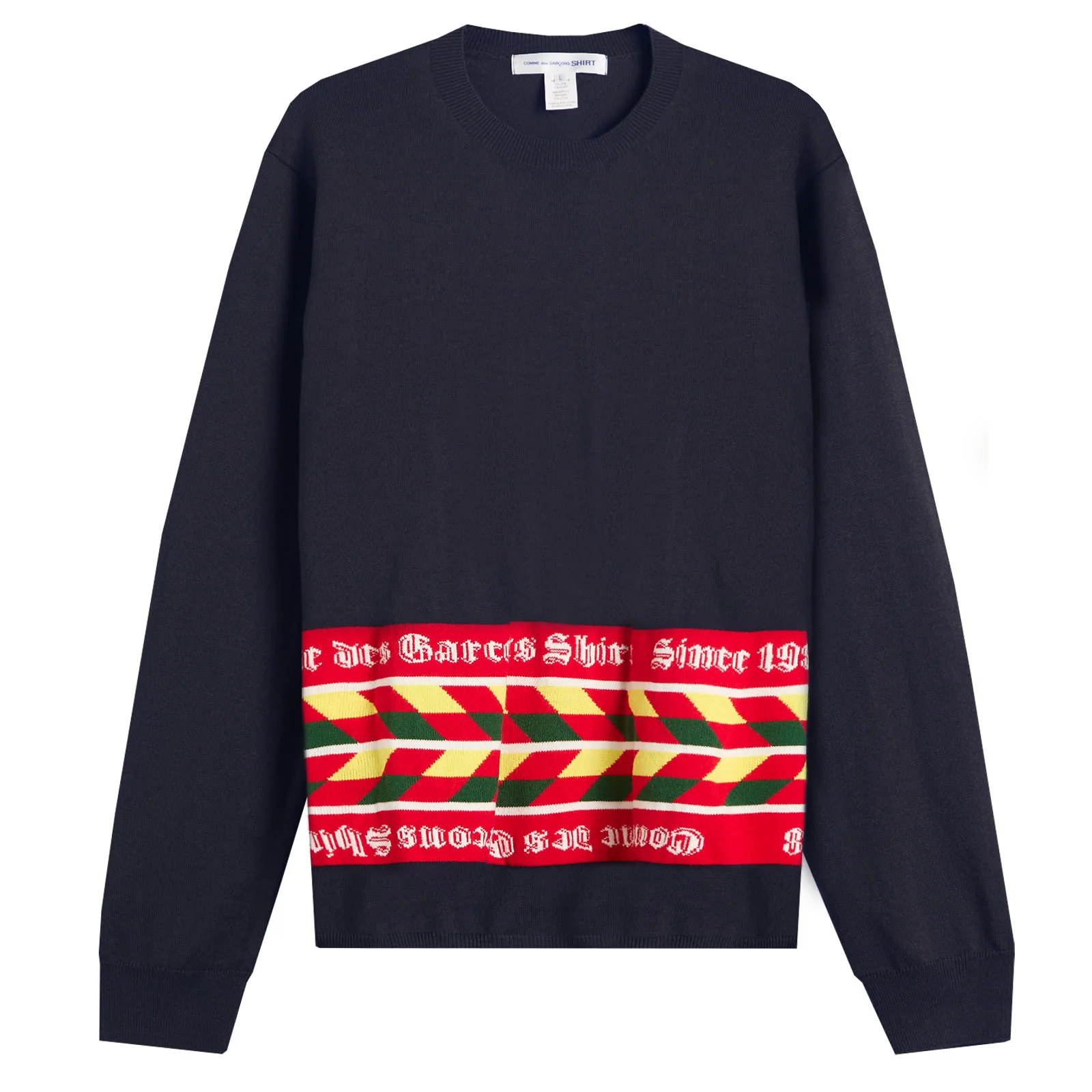 The Comme des Garcons top turns sports symbolism into subversive style. With a classic round neck and ribbed trims, it anchors itself in familiar knitwear form but the intarsia-knit scarf motif at the hem adds a graphic touch. It’s a playful clash of fan culture and fashion, wrapped up in a tactile wool blend that’s bold yet wearable. - 57% Acrylic, 23% Wool, 20% Nylon - Crewneck - Ribbed Trims - Intarsia Knit Football Scarf Hem - Made in France - Style Code: PP-K104-W25-1