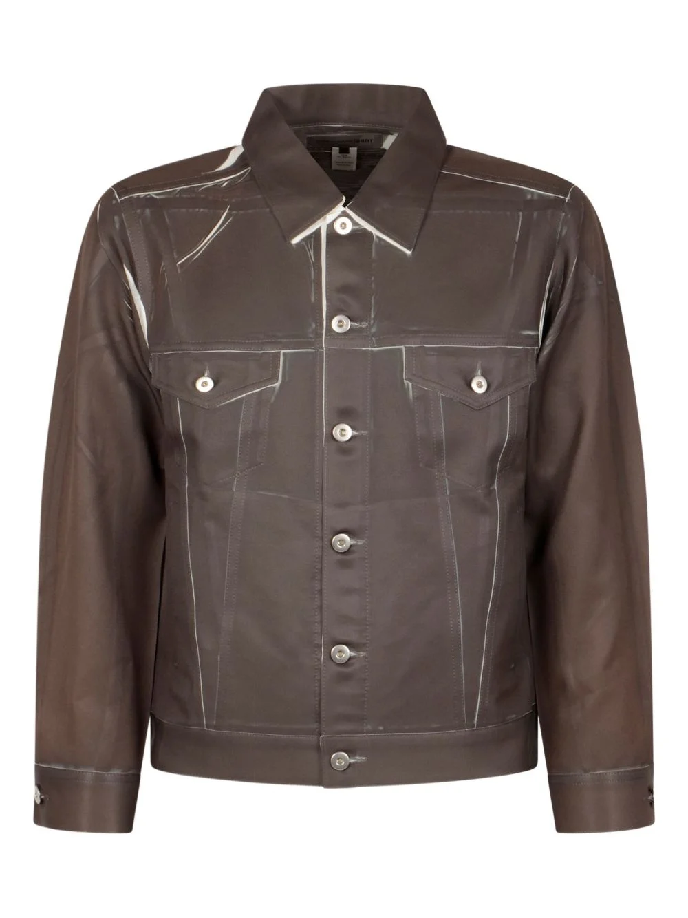 denim-print like jacket Highlights - Brown - Front button fastening - Two chest flap pockets - Two front welt pockets - Buttoned cuffs Imported Composition Polyester 100%