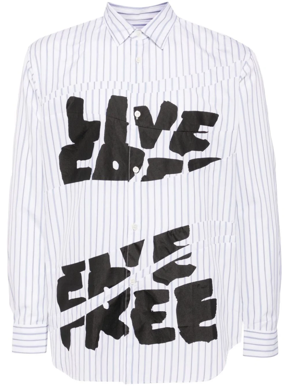 Free Curved printed striped shirt Highlights - Blue/white/black - Cotton - Poplin texture - Panelled design - Slogan print to the front - Vertical stripe pattern - Front button fastening - Classic collar - Shirt sleeves - Box-pleat detail - Curved hem - Regular fit Made in France Composition Cotton 100% SIZE & FIT Model measurements Height 6 ft 2 in(1.89 m) Bust/Chest 35.03 in(89 cm) Hips 34.64 in(88 cm) Waist 28.34 in(72 cm) FittingInformation Designed to be unstructured, offering a loose fit throughout Made from a midweight non-stretch fabric
