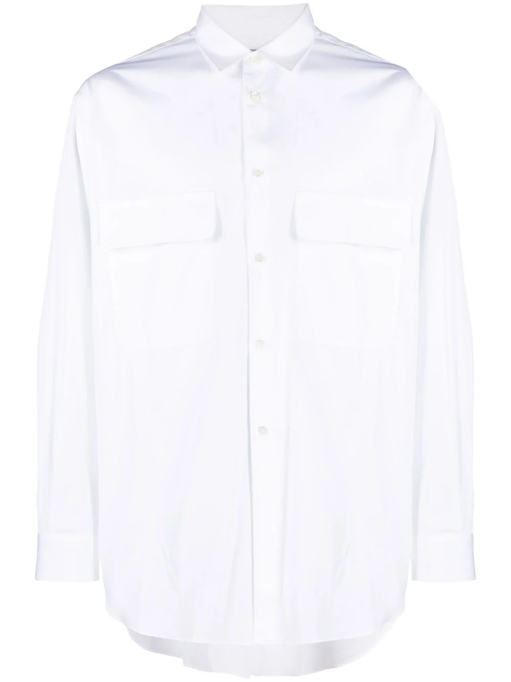 long-sleeve cotton shirt Highlights - White - Cotton - Classic collar - Front button fastening - Long sleeves - Buttoned cuffs - Two chest flap pockets - Curved hem Made in France Composition Cotton 100% SIZE & FIT Model measurements Height 6 ft 2 in(1.87 m) Bust/Chest 36.41 in(92.5 cm) Hips 35.43 in(90 cm) Waist 29.52 in(75 cm) FittingInformation Designed to be unstructured, offering a loose fit throughout Made from a midweight non-stretch fabric This piece fits true to size – take your usual size