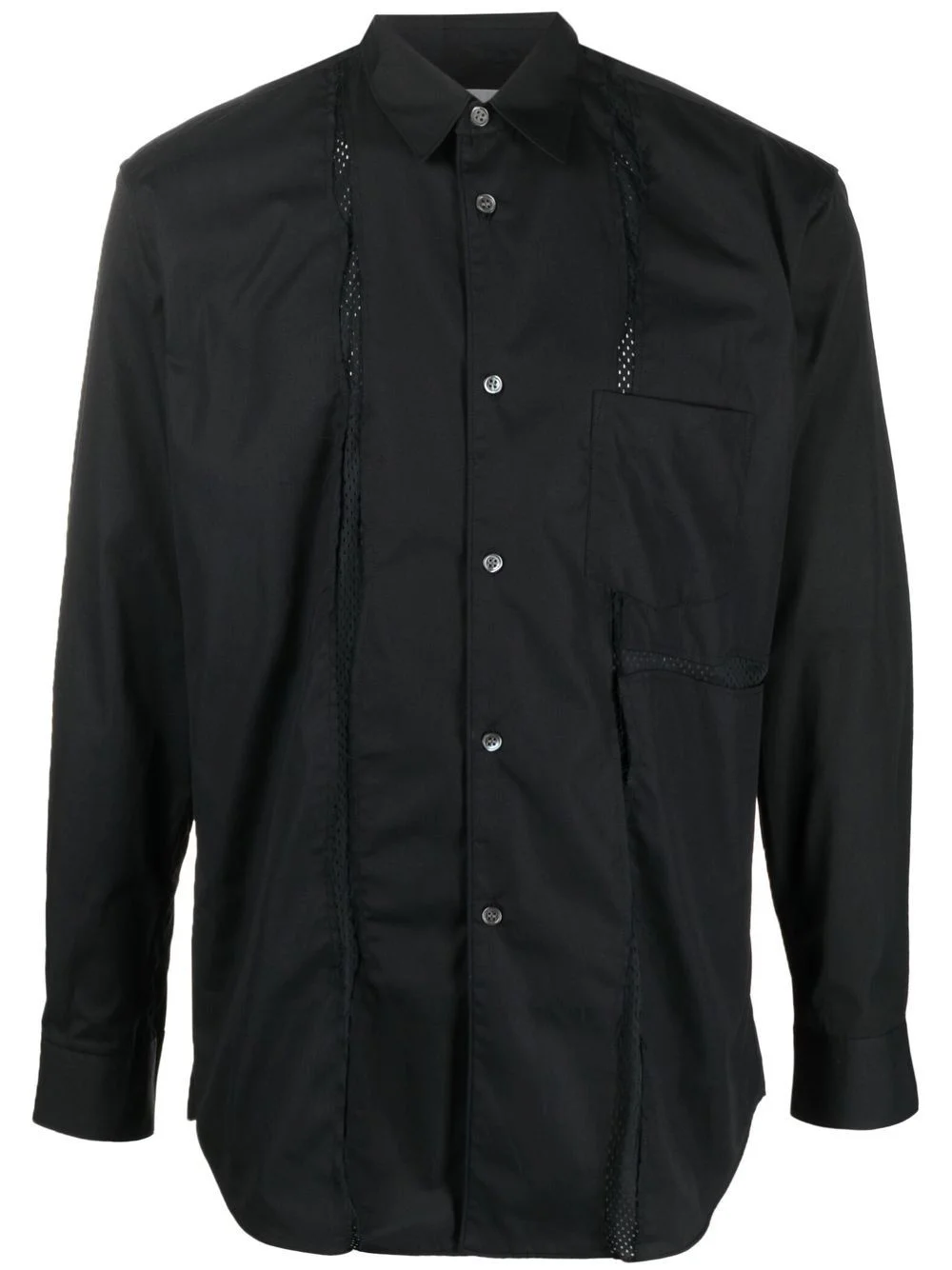mesh-panelled long-sleeve shirt black cotton mesh panelling classic collar front button fastening chest patch pocket long sleeves curved hem Made in France Composition Polyester 100%, Cotton 100% SIZE & FIT Model measurements Height 6 ft 1 in(1.85 m) Bust/Chest 35.82 in(91 cm) Hips 37.79 in(96 cm) Waist 29.13 in(74 cm) FittingInformation This piece fits true to size. We recommend you get your regular size Cut for a loose fit Made with a mid-weight non-stretch fabric